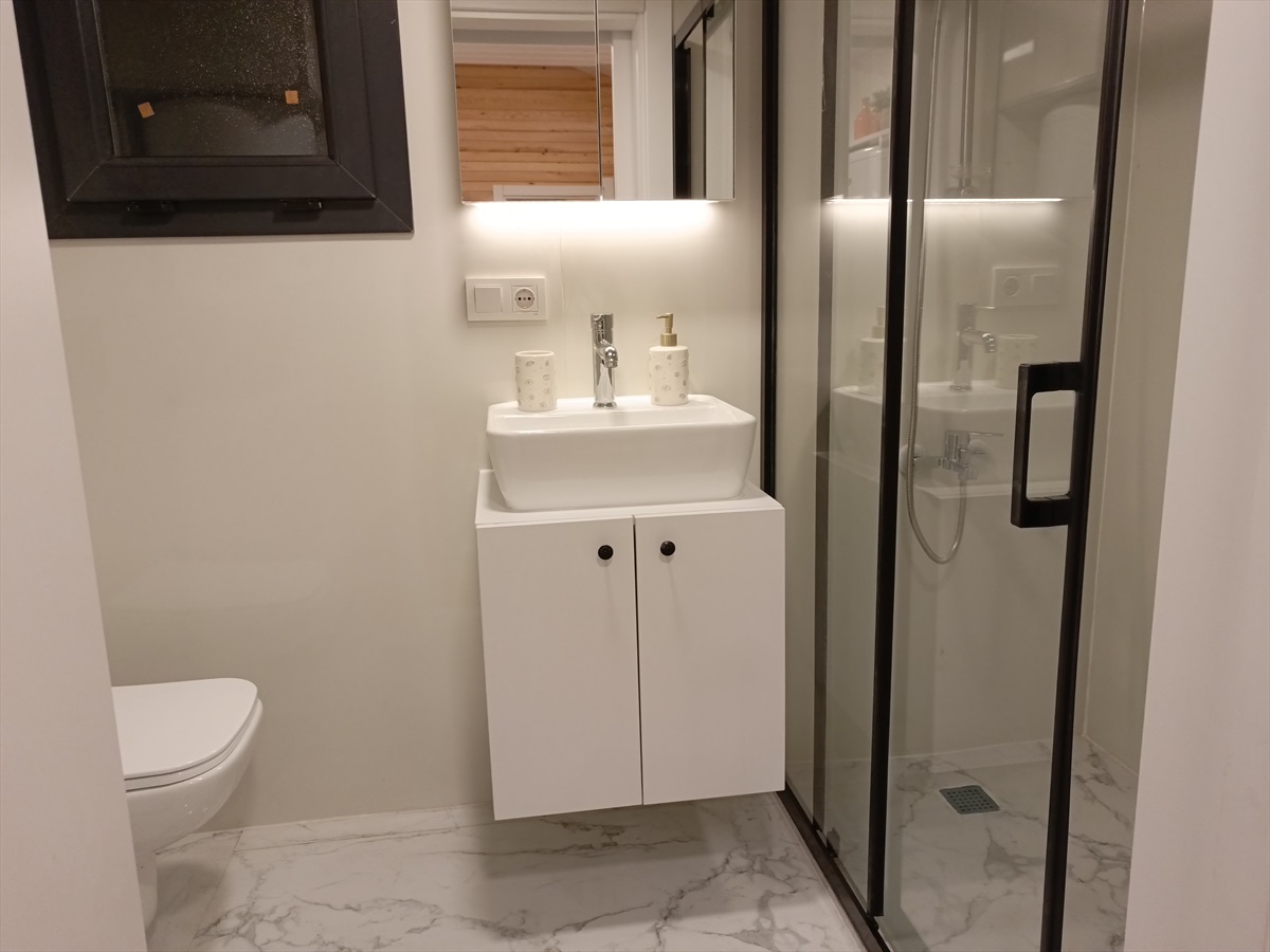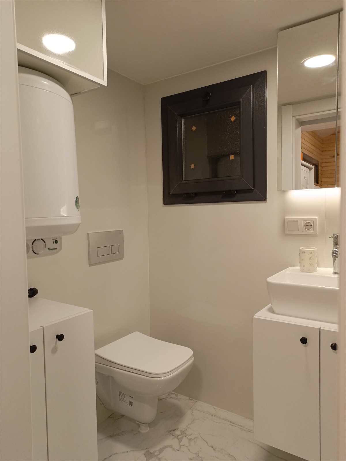 • Banyo zemini 1: beyaz akrilik panel , duvarları boardex üzeri su geçirmez duvar kağıdı