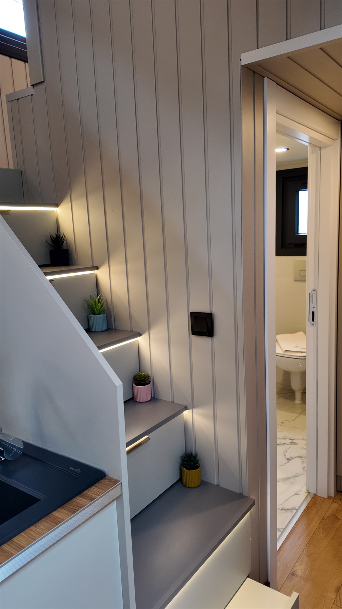 • Banyo zemini 1: beyaz akrilik panel , duvarları boardex üzeri su geçirmez duvar kağıdı