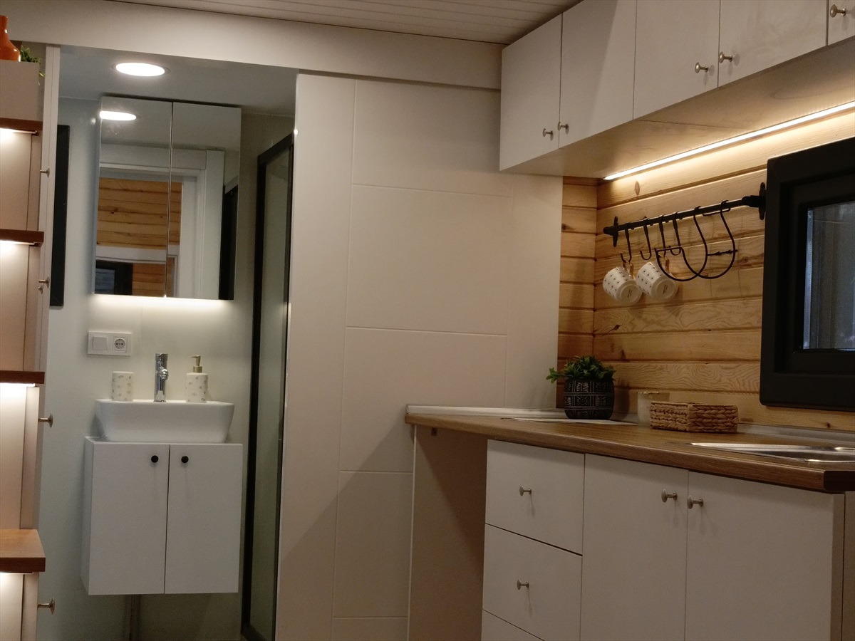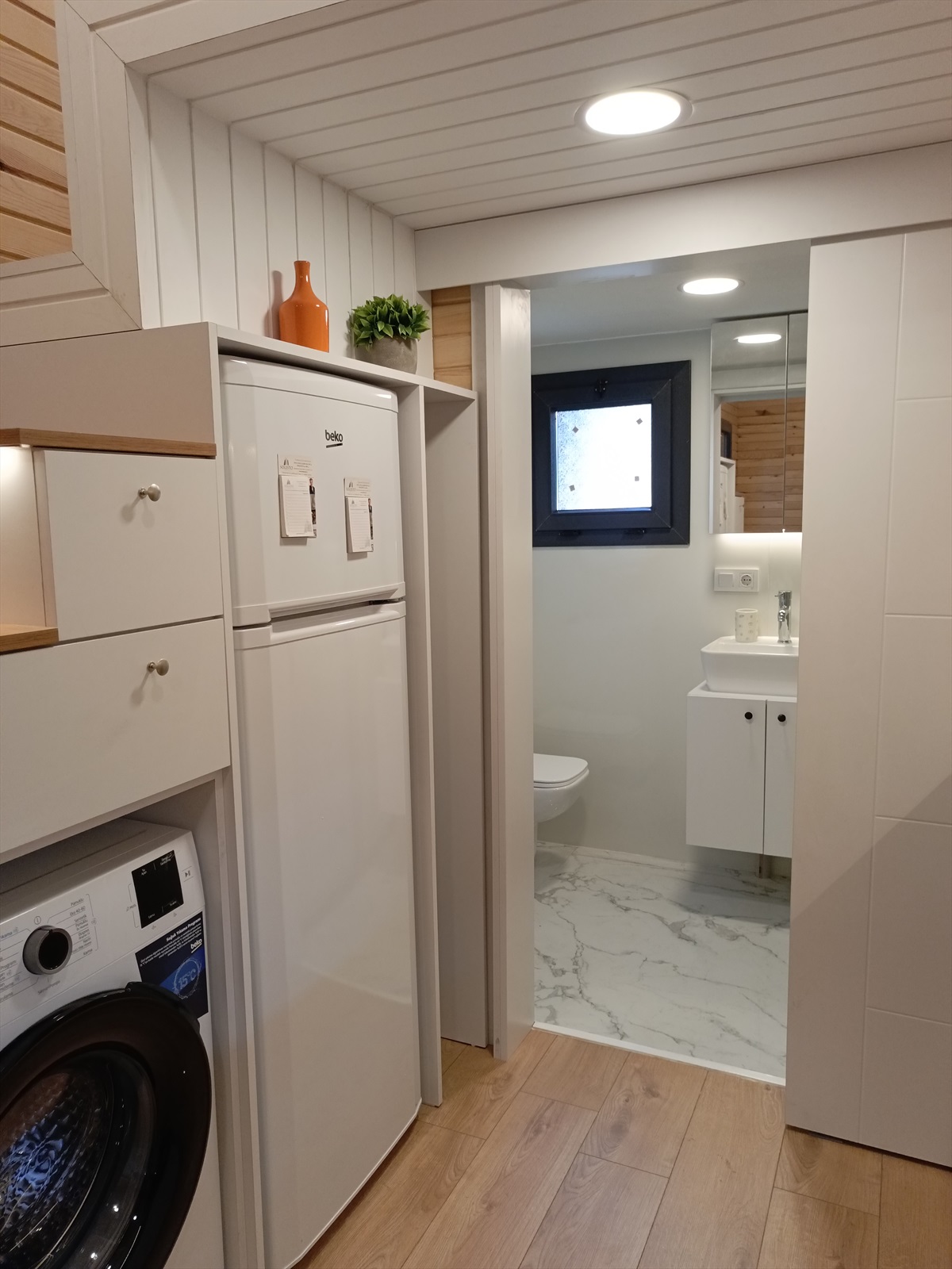 • Banyo zemini 1: beyaz akrilik panel , duvarları boardex üzeri su geçirmez duvar kağıdı